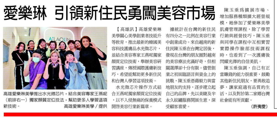 高雄愛樂琳美學關心美學創業者技能升等教育,推出最新的韓國美容科技護膚品水光微芯片,並結合王燕呢老師獨家顏質定位技術,舉辦美容研習講座,傳授國際護膚新技巧,希望能幫助更多新住民和台灣人學習這項技術。
